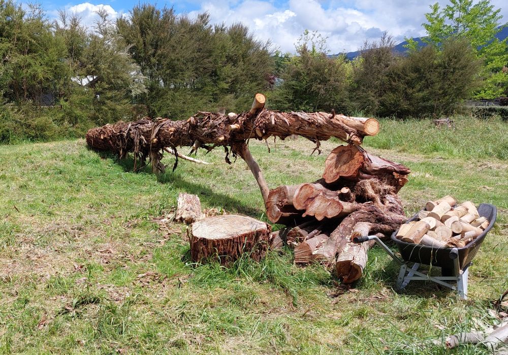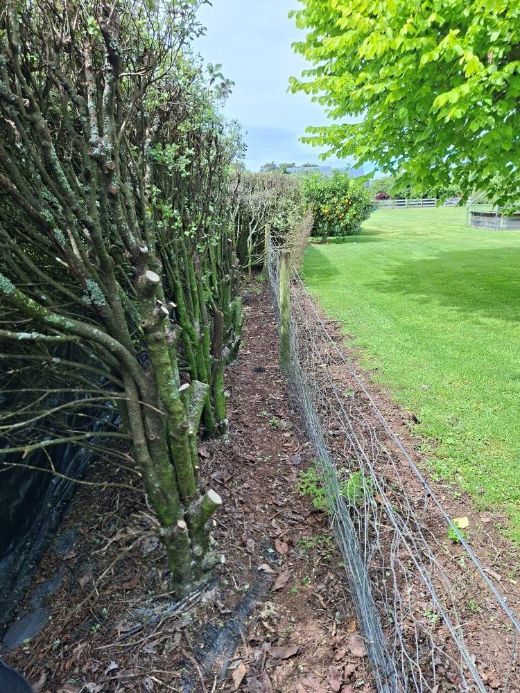 We’ve decided to have a high, wooden fence to replace the low post and wire fence behind the pittosporum hedge (which has died in a few places). In preparation for the installation of the new fence Peter has started cutting back the pittosporum so the contractors have a clear space to work in. Once the new fence is up, he can work on removing the rest of the hedge and the internal doggy proof fence we installed. Hopefully this will result in less hedge clipping work for Peter in the future. The hedge will be chipped for use as a mulch with the thicker trunks going for firewood.